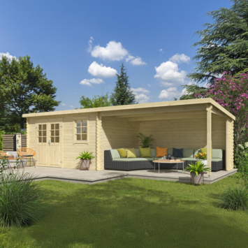 Het tuinhuis is gemaakt van geschaafd vurenhout en wordt onbehandeld geleverd. Het schuin aflopende dak zorgt voor afwatering aan de achterzijde. De blokhut kan gespiegeld worden opgebouwd, zodat je zelf kiest aan welke kant de overkapping komt. De dubbele deuren met glas worden geleverd met losse latten voor een 6-vlaks raamverdeling. Daarnaast is het tuinhuis voorzien van één draai-kiepraam dat naar binnen opent.