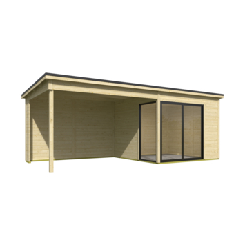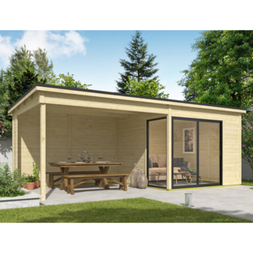 Dit modern vormgegeven tuinhuis Julia heeft een fundamentmaat van 646cm(b) x 295cm(d). De overkapping is 350cm breed. De 28mm dikke vurenhouten wanddelen zijn uitgevoerd met mes en groef. De stapelbouw methode in combinatie met hoekpalen en schroefsysteem zorgt voor een zeer sterke constructie. Dit mooie design tuinhuis wordt geleverd inclusief een aluminium schuifpui in de voorwand waarvan beide panelen schuivend zijn en het linker paneel afsluitbaar is met een sleutel. In de linkerzijde wordt een vast aluminium glaspaneel gemonteerd. De aluminium delen zijn mat antracietgrijs van kleur en de panelen zijn voorzien van enkelglas. Dit tuinhuis is door de enorme lichtinval ook geschikt als tuinkamer, atelier of als tuinkantoor. Onder de overkapping is het heerlijk beschut vertoeven. U kunt dit tuinhuis ook in spiegelbeeld monteren. Het basispakket wordt geleverd inclusief montagehandleiding, onderdelenlijst en uiteraard alle benodigde bevestigingsmaterialen. Voor langdurig plezier van uw tuinhuis, wordt aangeraden een EDPM dakbedekkingpakket aan te kopen om waterdichtheid te verzekeren. Dit stapelbouwbouw systeem is door een handige doe-het-zelver goed zelf te monteren, je moet wel even met z'n tweeën zijn. Dit tuinhuis wordt als bouwpakket bij u thuis geleverd.