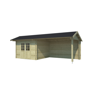 Deze blokhut heeft een kapschuurdak. Deze dakvorm geeft door de hoogte van de bijzondere dakconstructie aan de voorzijde een mooi en ruimtelijk beeld. De hoge deuren met lage dorpel maken het gemakkelijk om spullen, zoals bijvoorbeeld een fiets, in het tuinhuis te plaatsen. De latten voor de 6-vlaks raamverdeling op de ruit in de deur worden los meegeleverd.