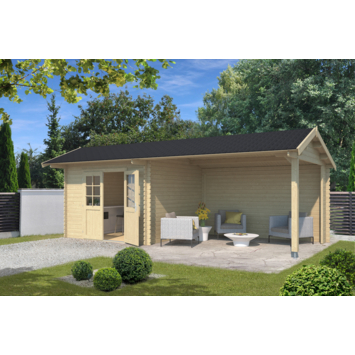 Deze blokhut heeft een kapschuurdak. Deze dakvorm geeft door de hoogte van de bijzondere dakconstructie aan de voorzijde een mooi en ruimtelijk beeld. De hoge deuren met lage dorpel maken het gemakkelijk om spullen, zoals bijvoorbeeld een fiets, in het tuinhuis te plaatsen. De latten voor de 6-vlaks raamverdeling op de ruit in de deur worden los meegeleverd.
