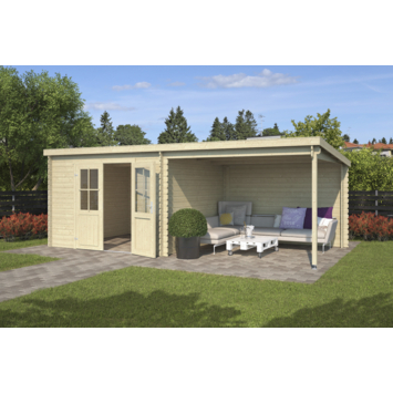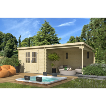 Tuinhuis Olaf is een moderne en ruime blokhut met een prachtige overkapping.