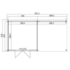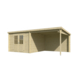 Deze blokhut met overkapping is voorzien van een schuin aflopend dak met de afwatering aan de achterzijde. Dit type blokhut met overkapping kan gespiegeld worden opgebouwd. In dat geval wordt het overkapte deel aan de linkerkant geplaatst en het dichte gedeelte rechts. De latten voor de 4-vlaks raamverdeling op de ruit in de deur worden los meegeleverd.