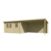 Dit tuinhuis is gemaakt van geschaafd vurenhout en wordt onbehandeld geleverd. Het schuin aflopende dak heeft de afwatering aan de achterzijde. De blokhut kan gespiegeld worden opgebouwd, waarbij het overkapte deel links en het dichte gedeelte rechts komt. Dankzij de hoge deuren met lage dorpel plaats je ook grotere spullen, zoals een fiets, eenvoudig in het tuinhuis.