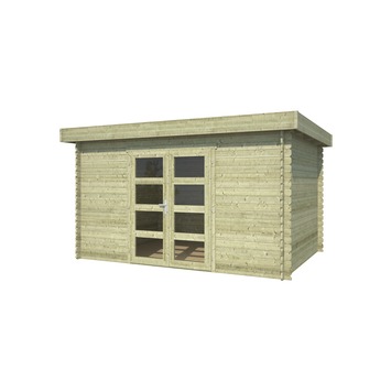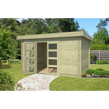 Met het tuinhuis Mikkel haal je een praktisch en licht tuinhuis in je tuin. Het tuinhuis is gemaakt van geïmpregneerd vurenhout met een wanddikte van 28 mm. Dankzij de stapelbouwmethode zet je het eenvoudig in elkaar: de planken met tand- en groefprofielen stapel je laag voor laag zonder steunpilaren. Dit systeem zorgt voor een stevige constructie en een strak uiterlijk. Het tuinhuis heeft een platte dakconstructie met een lichte helling en een kleine overstek, wat zorgt voor een natuurlijke afwatering van regenwater.
