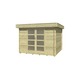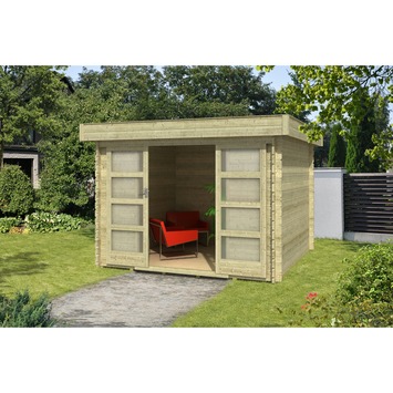 Tuinhuis Minnesota 300 met platdak is gemaakt van Noord Europees vurenhout met een wanddikte van 2,8cm. Afmeting 318cm x 318cm. Het tuinhuis is uitgevoerd met een verhoogde dubbele schuifdeur (139cm x 188,5cm) voorzien van mat kunststofglas en cilinderslot. Dit tuinhuis is voorzien van een overkapping 300cm en is voorzien van een inbouwwand aan de achterzijde. De overkapping kan je links of rechts aanbouwen. Het dak van het tuinhuis bestaat uit vuren dakdelen met messing en groef in 15mm dikte, de massieve geveldelen zijn 28mm dik. Als dakbedekking wordt duurzaam EPDM dakrubber (1,14mm), een dakdoorvoer en afvoerpijp geleverd. Deze moderne stapelbouw tuinhuis is voorzien van de zeer sterke traditionele hoekverbinding en wordt standaard geleverd inclusief dakverankering, hang en sluitwerk en een duidelijke opbouwbeschrijving. Dit tuinhuis is rondom behandeld middels dompelimpregnatie. Hierbij krijgt het hout een oppervlakte behandeling middels een dompelproces met een kleurbeits. Het grote voordeel hiervan is dat hierbij ook de plekken beschermd worden die je later zelf met de kwast niet meer kunt behandelen. Deze dompelmethode beschermt je tuinhuis voor circa 1 à 2 jaar, afhankelijk van de standplaats. Wij adviseren om je tuinhuis jaarlijks te controleren en regulier onderhoud uit te voeren.