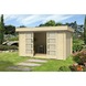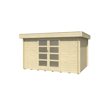 Het tuinhuis Nebraska 398x318 cm is een riant tuinhuis gemaakt van vurenhout. Het tuinhuis heeft een plat dak bekleed met EPDM rubber en heeft ruiten van kunststof. De wanden zijn maar liefst 28 mm dik en daarmee behoorlijk stevig. Wat dit tuinhuisje bijzonder maakt, is het gebruik van dubbele schuifdeuren van maar liefst 139 cm breedte. Omdat je geen rekening meer hoeft te houden met de draaihoek van traditionele deuren maak je optimaal gebruik van de buitenruimte. Tegelijkertijd is het huisje van een brede ingang voorzien. Zo kunnen ook grotere voorwerpen probleemloos naar binnen gebracht worden. Het tuinhuis Nebraska 398x318 cm wordt overigens geleverd inclusief hang- en sluitwerk. Het tuinhuisje kan daardoor snel in gebruik genomen worden.