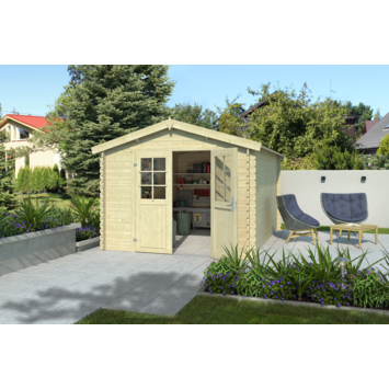 Tuinhuis Norah is een praktische en royale blokhut met een traditionele uitstraling. Achter de afsluitbare dubbele deur met lage dorpel is bergruimte voor waardevolle spullen en/of tuingereedschap.