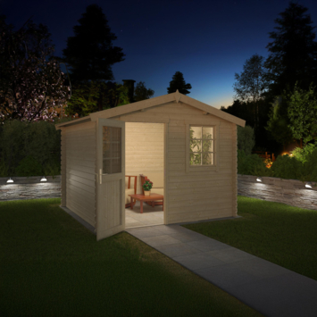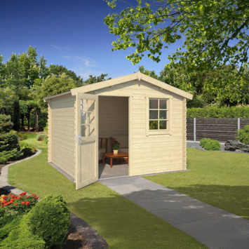 Dit tuinhuis is gemaakt van geschaafd vurenhout en is onbehandeld. De wanden hebben een dikte van 28 mm en worden opgebouwd met een traditionele stapelbouwmethode. De planken stapel je laag voor laag op elkaar zonder steunpilaren. Het dak is een zadeldak en moet afgewerkt worden met shingles om het tuinhuis waterdicht te maken. Alle maatvoeringen zijn circa maten.