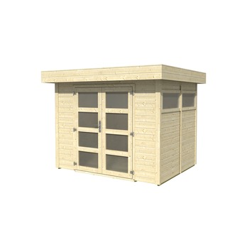 Het tuinhuis Vermont 255x198 cm is een tuinhuis gemaakt van vurenhout. Het huisje is voorzien van een plat dak bekleed met dakleer. Het tuinhuis is 255 bij 198 centimeter groot en heeft een wanddikte van 19 millimeter. De dubbele deuren zijn 175 bij 139 centimeter groot en zijn voorzien van ruiten van kunststof matglas. Daarmee is de inkijk beperkt wanneer het huisje afgesloten is. Dit tuinhuis wordt geleverd inclusief dakleer en hang- en sluitwerk.