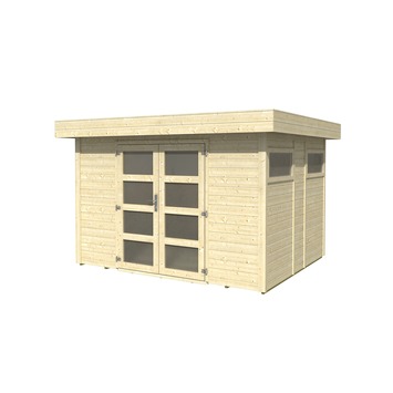 Het tuinhuis Vermont is een tuinhuis gemaakt van vurenhout. Het schuurtje is voorzien van een plat dak bekleed met dakleer. Het tuinhuis is 300 bij 245 centimeter groot en heeft een wanddikte van 19 millimeter. De dubbele deuren zijn 175 bij 139 centimeter groot en zijn voorzien van ruiten van kunststof matglas. Daarmee is de inkijk beperkt wanneer het huisje afgesloten is. Dit Tuinhuis Vermont Onbehandeld Hout 300x245 cm wordt geleverd inclusief een bijpassende houten vloer, dakleer en hang- en sluitwerk. Dit tuinhuis is een wat luxure berging. De opbergruimte kun je bijvoorbeeld goed gebruiken om fietsen of tuinkussens in te bewaren. Die staan daardoor altijd droog en de kussens liggen nooit meer binnen in de weg.