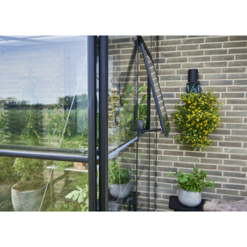 De Qube Lean-To 68 is een praktische muurkas met zeer fraaie uitstraling. Het gehele kasframe wordt samengesteld uit één aluminium vierkant (Qube) profiel. Het veiligheidsglas wordt vastgezet met tape en dubbele beglazingsstrip. Het dak van de kas is voorzien van 6 mm dik opaal polycarbonaat wat een isolerende functie heeft en prettig diffuus licht in de muurkas geeft. Deze kas heeft een 80 mm brede goot aan de voorzijde welke voorzien is van aansluitstukken voor een regenpijp. Als accessoire is een regenpijpset Ø 40 mm (tot op het maaiveld) leverbaar. De dubbele schuifdeur met handgreep is 184 cm hoog en voorzien van een telescopische deurrail. De drempel is zeer laag waardoor de kas goed toegankelijk is. De Qube Lean-To 68 is standaard voorzien van een zwarte coating. De nokbalk, goten en optionele fundering worden geleverd in meerdere koppelbare delen. Voor alle modellen van de Qube is optioneel een zwart gecoate kweektafel leverbaar. Deze tafels zijn ca. 60 cm breed en loopt over de lengte van de zijgevel van de kas.