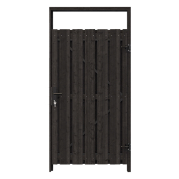 Daarnaast bevat het pakket twee verzinkte en zwart gecoate duimen van 16 mm rond ijzer, waarmee je de hengen aan de paal kunt bevestigen. Voor de plaatsing van deze deur wordt geadviseerd om palen van minimaal 85x85 mm te gebruiken voor extra stabiliteit. Het hout van de tuindeur is gemaakt van grenen, een harsrijke en van nature zachte naaldhoutsoort die populair is in Europa. Om de levensduur te verhogen, is het hout vacuümdruk geïmpregneerd met Tanalith E, wat het hout beschermt tegen schimmels en de levensduur verlengt tot 5-10 jaar. Na de impregnatie is de deur in zwart gedompeld, wat zorgt voor een moderne en strakke uitstraling.