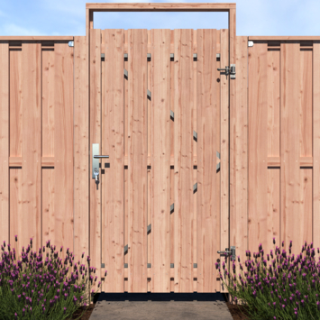 De tuindeur recht Douglas geschaafd op metalen frame is een robuuste keuze voor je tuin. Deze tuindeur heeft afmetingen van 190 cm hoog, 100 cm breed en 5,2 cm diep en biedt dankzij de 13 verticale Douglas planken minimale doorkijk. De planken zijn stevig bevestigd op een metalen frame met roestvrijstalen schroeven, wat zorgt voor een solide constructie. De deur is tweezijdig en kan zowel links- als rechtsdraaiend worden gemonteerd, waardoor je flexibiliteit hebt bij het installeren. Hengen worden meegeleverd, zodat je direct aan de slag kunt.