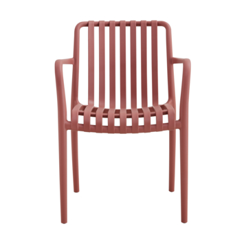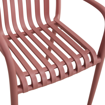 De tuinstoel wordt volledig gemonteerd geleverd, zodat je direct kunt genieten van je nieuwe zitplaats. Hoewel kussens niet zijn inbegrepen, kunnen ze eenvoudig worden toegevoegd voor extra comfort. Het terracotta kunststof geeft de stoel een warme en uitnodigende uitstraling, die mooi aansluit bij diverse tuin- en terrasstijlen.