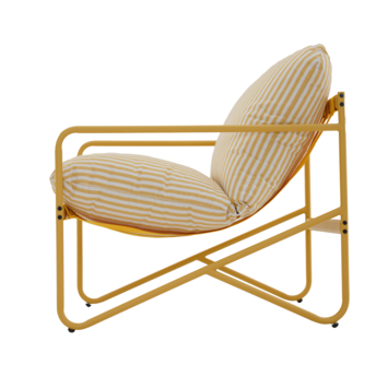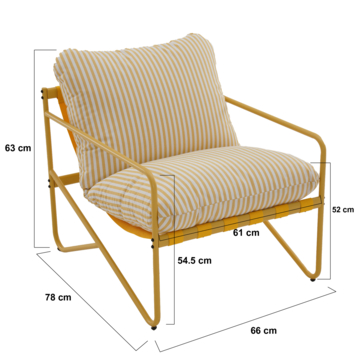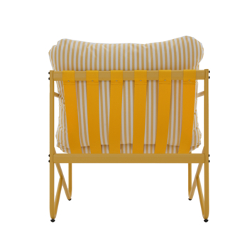 De zitting en het metalen frame zijn uitgevoerd in een warme okergele kleur, wat zorgt voor een opvallende, maar harmonieuze toevoeging aan elke buitenruimte. De meegeleverde zit- en rugkussens bieden extra comfort, waardoor je optimaal kunt genieten van lange zomeravonden buiten.