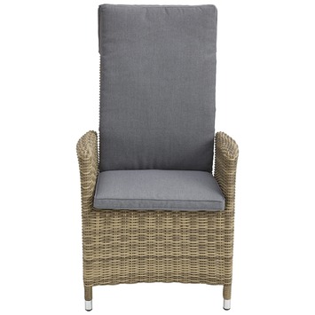 De tuinstoel Lesina is een luxe, comfortabele verstelbare dinerstoel uit de Pure Collection. De stoel is 86 centimeter hoog, 57,5 centimeter breed en heeft een zithoogte (inclusief kussen) van 43 centimeter en een zitbreedte van 46 centimeter. De stoel is gemaakt van opgeruwd beige wicker (vlechtwerk) dat in combinatie met de aluminium poten voor een natuurlijke luxe uitstraling zorgt. De rugleuning is traploos verstelbaar. Zo kun je altijd in de door jouw gewenste houding zitten. De stoel wordt geleverd met een zit- en rugkussen, wat bijdraagt aan het comfort van deze luxe stoel. Combineer deze luxe en comfortabele dinerstoel Lesina eventueel met andere tuinmeubelen uit de Lesina-serie.