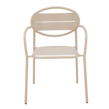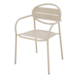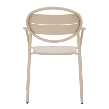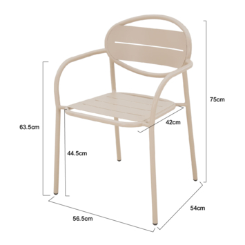 De stoel heeft een zithoogte van 45 cm en armleuningen van 63,5 cm, wat plaatsnemen en opstaan makkelijk maakt. Het metalen frame met poedercoating zorgt voor stabiliteit en een lange levensduur, geschikt voor dagelijks gebruik buiten.