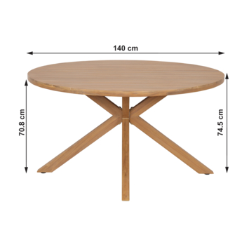 Met een diameter van 140 cm passen zes stoelen comfortabel rond de tafel. De hoogte tot onderkant tafel van 71 cm zorgt voor genoeg beenruimte. Het dikke blad is stevig en stabiel, geschikt voor dagelijks gebruik.