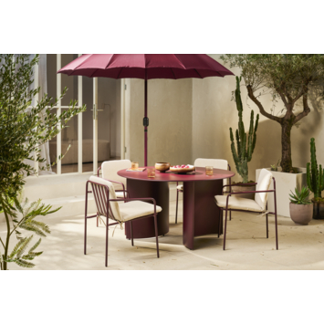 De Luna tuintafel in burgundy biedt direct een stabiele en stijlvolle eetplek voor vier personen.