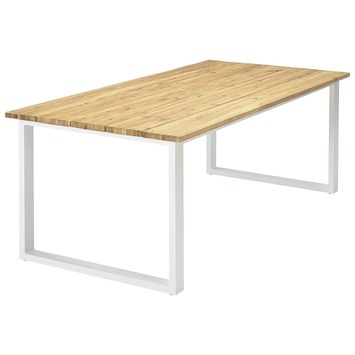 Ik heb de tafel al weer 2 jaar, maar het aluminium onderstel wiebelt en is zeer onstabiel. Ik heb het hout inmiddels al verschilende keren geschuurt en gelakt, het is erg lelijk geworden. Een miskoop.