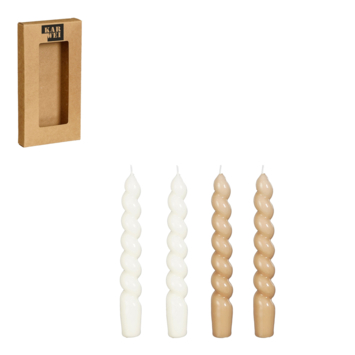 Deze trendy Twist dinerkaarsen geven elke kandelaar een bijzondere uitstraling, vooral in combinatie met de glanzende witte en lichtbruine kleuren! Ze zijn erg leuk om 's avonds aan te steken, maar dienen ook overdag als decoratief element. De set bevat vier kaarsen, gemaakt van paraffine. De kaarsen hebben de afmetingen H19 xø3 cm.