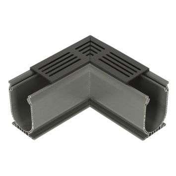 Met dit hoekstuk kan je de afvoergoot eenvoudig koppelen als deze langs de hoek van het terras is aangelegd om het zo mooi aan een stuk door te laten lopen.