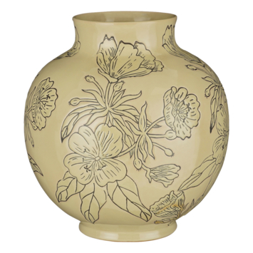 Deze vaas valt direct op door zijn ronde vorm en zachte beige tint. Het bloemenreliëf geeft de vaas een speels en sierlijk karakter dat meteen wat leven in de ruimte brengt. Met een hoogte van 33 cm en een diameter van 30 cm is er genoeg ruimte voor een volle bos bloemen, losse takken of een mix van droogbloemen. Ook zonder inhoud staat hij mooi op een dressoir, kast of vensterbank. De neutrale kleur laat zich makkelijk combineren met warme materialen en andere keramieken accessoires.
