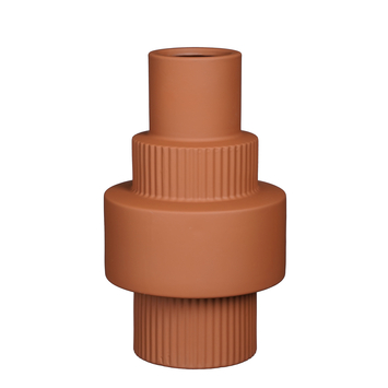 Deze ronde bloemenvaas heeft een industriële uitstraling. Het is een bruin model dat vervaardigd is uit keramiek. Het middenstuk heeft een ontwerp dat bestaat uit verschillende niveaus. Deze niveaus hebben de uitstraling van schroeven of tandwielen. Dit geeft deze bloemenvaas een zeer stoer- en robuust karakter. Met een totale afmeting van 30 cm hoog en een diameter van 17,5 cm is deze vaas zeker geschikt voor een prachtig bloemenboeket met lange stelen.
