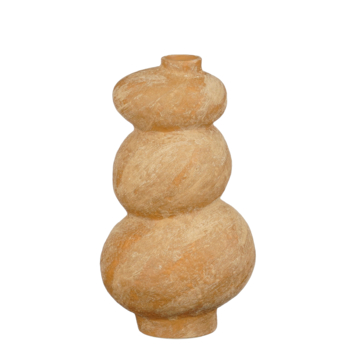 Deze bruine keramieken vaas valt direct op door zijn unieke, ronde vorm. De matte textuur en natuurlijke kleur geven je interieur een warme, rustieke touch. Prachtig als solostuk op een dressoir, maar ook mooi met een paar takken erin. De speelse lijnen maken hem tot een kunstobject op zich. De afmetingen zijn L18,5 x B15,5 x H32,5 cm.