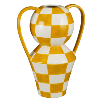 Deze vaas springt direct in het oog door het unieke design. De keramische vaas is geel met wit geblokt en heeft gele handvatten aan de zijkanten. De kleuren in combinatie met het design zorgen ervoor dat hij echt een blikvanger is. De vaas staat daarom prachtig als decoratief stuk op zichzelf in de woonkamer, maar met een opening vanø6,5 cm past er ook perfect een boeket bloemen in! Verder is de vaas handgemaakt en daardoor uniek. De afmetingen zijn L27 x B17,5 x H33,5 cm. | Let op: omdat dit een handgemaakt product is, kan de kleur, maat of vorm bij ieder item iets afwijken. Daarnaast zijn keramieken vazen poreus en nooit 100% waterdicht.