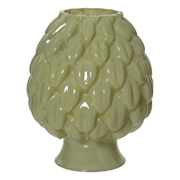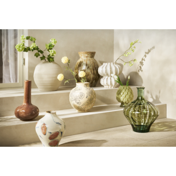 Decoris vaas groen, 26,5 cm, glanzend melkachtig glas Breng natuurlijke rust in je home met deze unieke glazen vaas van Decoris. Het handgemaakte ontwerp heeft een opvallende textuur die doet denken aan bladeren, terwijl de zachte groen kleur met een melkachtige finish het een serene uitstraling geeft. Met zijn ronde vorm en glanzende oppervlak is deze vaas een stijlvolle toevoeging aan elke kamer. Het ontwerp combineert vakmanschap met een frisse, tijdloze stijl. - Gemaakt van glas - Afmetingen: 26,5 cm hoog, 22 cm diameter - Waterbestendig - Geschikt voor binnen gebruik