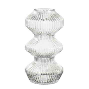 Deze vaas is het perfecte item om toe te voegen aan jouw collectie van bloemenvazen. De prachtige vaas is van geribbeld glas dat transparant is. De bolvormen maken hem nét iets anders dan andere vazen - uniek! Het is de perfecte bloemenvaas voor het presenteren van je favoriete bloemen of gewoon als decoratief stuk op zichzelf. Of je hem nu op het dressoir, eettafel of in de vensterbank plaatst, hij voegt een trendy accent toe! De afmetingen zijn H30 xø16 cm.
