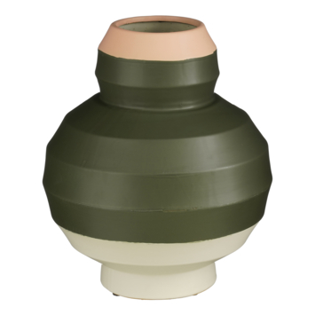 Deze prachtige vaas, gemaakt van keramiek, heeft een sfeervolle kleurencombinatie van groen, zalmroze en lichtgrijs. Daarnaast heeft hij een gelaagd ontwerp dat simpel, maar stijlvol is. Deze vaas is ideaal voor het presenteren van verse bloemen, droogbloemen, of gewoon als een prachtig decoratief object op zichzelf. De warme kleuren en het strakke ontwerp maken het een veelzijdig stuk dat in verschillende kamers past, van de woonkamer tot de slaapkamer of zelfs op kantoor. De hoogte van de vaas is 40 cm en de diameter 33,5 cm.