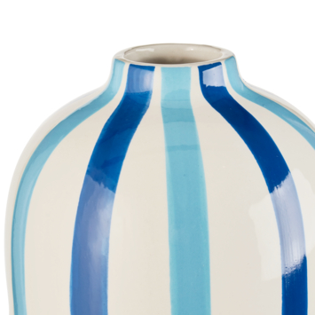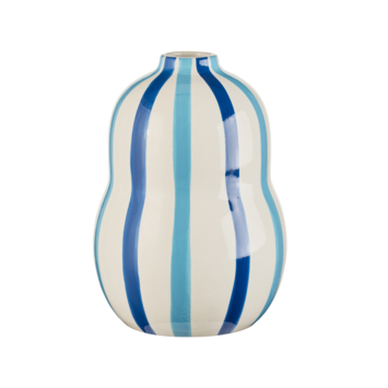 Deze prachtige blauw gestreepte vaas is de perfecte aanvulling op elke kamer in huis. Met zijn prachtige kleur en gestreepte patroon zal deze vaas een onmiddelijke blikvanger zijn. Je kan de vaas gebruiken alleen ter decoratie of om mooie bloemen in te plaatsen. De vaas is gemaakt van keramiek en zo'n 23,5 cm hoog.