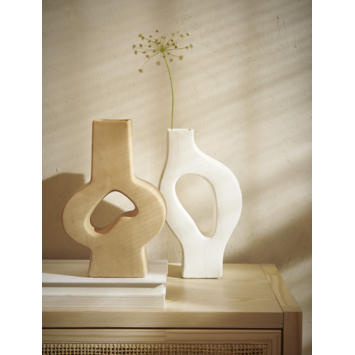 Vazen zijn er te kust en te keur, maar een exemplaar als dit loop je niet dagelijks tegen het lijf. Z'n unieke vormgeving, in combinatie met z'n lichtbruine kleur, kan niet over 't hoofd worden gezien. Afmeting: L x B x H: 17 x 7 x 26,5 cm.
