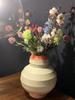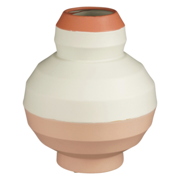 Deze prachtige vaas, gemaakt van keramiek, heeft een zachte kleurencombinatie van off-white, zalmroze en terracotta. Daarnaast heeft hij een gelaagd ontwerp dat simpel, maar stijlvol is. Deze vaas is ideaal voor het presenteren van verse bloemen, droogbloemen, of gewoon als een prachtig decoratief object op zichzelf. De warme kleuren en het strakke ontwerp maken het een veelzijdig stuk dat in verschillende kamers past, van de woonkamer tot de slaapkamer of zelfs op kantoor. De hoogte van de vaas is 40 cm en de diameter 33,5 cm.