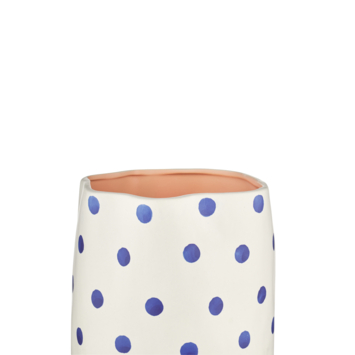 De combinatie van het rustige wit en de speelse blauwe stippen maakt de vaas veelzijdig en geschikt voor verschillende interieurstijlen, van minimalistisch tot modern of zelfs retro. Het eenvoudige ontwerp zorgt ervoor dat de vaas zowel met bloemen als zonder inhoud een prachtig statement maakt.