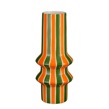 Hoe prachtig is deze vaas? Gemaakt van hoogwaardig porselein en in de kleuren groen en oranje die in verticale lijnen over de vaas lopen. Doordat de vaas een smalle opening heeft, is hij erg geschikt voor een paar bloemen - dat staat erg schattig in jouw interieur! De hoogte is 23,5 cm en de diameter is 9,5 cm. Weet jij al waar je hem gaat zetten?