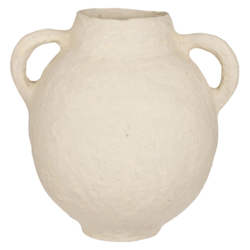 Door het gebruik van papier-maché heeft deze vaas een unieke uitstraling. Dat is eens iets anders dan een strak design! De off white kleur is mooi neutraal, waardoor hij in elk interieur past. Zet de vaas zo neer, of vul hem met wat pluimen, kunstbloemen of siertakken. De afmetingen zijn L34 x B26 x H33 cm.