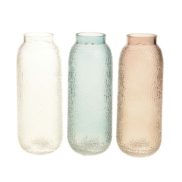 Vaas reliëf glas Ø9x23 cm is een set van drie vazen in de kleuren helder, marineblauw en grijs. Zowel samen als apart is het een leuke toevoeging aan uw interieur. De mooie, subtiele bloemen als opdruk maken de vazen helemaal af. De vazen zijn ook beschikbaar in een andere maat, namelijk Ø10x33 cm. Vaas reliëf glas Ø9x23 heeft een diameter van 9 cm en is 23 cm hoog.
