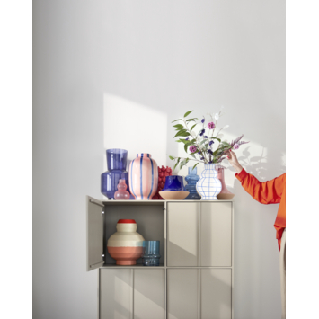 Kleur en stijl aan je interieur toevoegen? Dan is deze keramieken vaas perfect. Hij heeft een roze basiskleur met donkerblauwe strepen die verticaal over de vaas lopen. Zet hem op het midden van de tafel, op een dressoir of op een bijzettafel. Welke plek dan ook, hij zorgt voor een frisse look! De afmetingen zijn H38 x Ø24 cm.