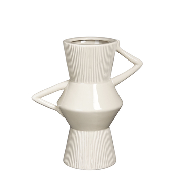 Deze grappige bloemenvaas heeft de contouren van een vergeetachtig persoon met een bolle- en hoekige buik. De twee handvaten met hoekige ellebogen steken aan weerszijden uit alsof iemand zijn ene hand in zijn zij zet en met de andere hand zich achter zijn oren krabt. Het kopstuk en de onderzijde zijn voorzien van verticale strepen en het geheel is gemaakt van dolomiet met een taupe kleur. Hij heeft een totale afmeting van 21 cm lang, 12 cm breed en 23,5 cm hoog. Dit is niet alleen een leuke vaas om je eigen interieur op te vrolijken, hij is ook heel leuk als cadeau met een paar fleurige bloemen erin.