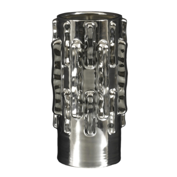 Deze zilverkleurige vaas valt meteen op door zijn unieke, reliëfachtige structuur. Het glanzende keramiek en het speelse patroon zorgen voor een moderne, luxe uitstraling. Perfect als statement piece op een kast, bijzettafel of in de vensterbank. Ook zonder bloemen is deze vaas een echte blikvanger. De afmetingen zijn H28 x ø15 cm.