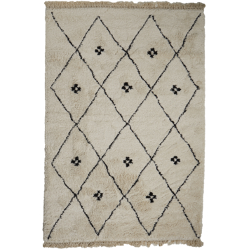 Het vloerkleed Varamin crème/zwart bloem is een warm hoogpolig karpet dat is voorzien van een fraai dessin en een satin look en is afgewerkt met mooie franjes. Het ruitpatroon voorzien van speelse bloemetjes zorgt voor een eigentijdse en trendy uitstraling en maakt je kamer op een fraaie wijze helemaal af. Met dit kleed maak je een echte statement: doei saaie vloer, hallo warm en sfeervol interieur! De karpetten uit deze serie zijn voorzien van originele, speelse berberpatronen en gemaakt van een oersterk materiaal: synthetisch textiel. Dit maakt dat het kleed zeer slijtvast is, neemt heel weinig vocht op, behoudt zijn kleur en is bijna niet statisch. Het is daarom geen probleem om voor langere tijd een meubel op het kleed te zetten. Met dit Varamin kleed haal je een echte blikvanger in huis die erg goed tot zijn recht komt in vele interieurs en woonstijlen. De hoogte van de Varamin collectie is 3,5 cm, dat maakt het een vrij dik kleed. Door het zachte materiaal is het erg prettig voor je voeten. Heerlijk als je op de bank zit, toch? Het kleed is zeer geliefd bij mens als huisdier! Het kleed is overigens ook verkrijgbaar in de afmeting 130 x 230 cm en 200x290 cm. Daarom is het Varamin vloerkleed crème/zwart bloem 35 mm 120x170 cm een prachtige investering in je woning.