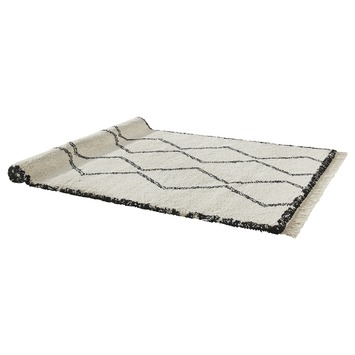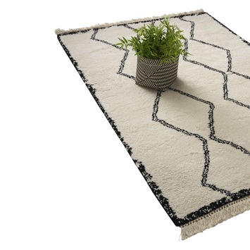 Het vloerkleed Varamin wit/zwart zig/zag is een warm hoogpolig karpet dat is voorzien van een fraai dessin en een satin look en is afgewerkt met mooie franjes. Het zigzag patroon zorgt voor een eigentijdse en trendy uitstraling en maakt je kamer op een fraaie wijze helemaal af. Met dit kleed maak je een echte statement: doei saaie vloer, hallo warm en sfeervol interieur! De karpetten uit deze serie zijn voorzien van originele, speelse berberpatronen en gemaakt van een oersterk materiaal: synthetisch textiel. Dit maakt dat het kleed zeer slijtvast is, neemt heel weinig vocht op, behoudt zijn kleur en is bijna niet statisch. Het is daarom geen probleem om voor langere tijd een meubel op het kleed te zetten. Met dit Varamin kleed haal je een echte blikvanger in huis die erg goed tot zijn recht komt in vele interieurs en woonstijlen. De hoogte van de Varamin collectie is 3,5 cm, dat maakt het een vrij dik kleed. Door het zachte materiaal is het erg prettig voor je voeten. Heerlijk als je op de bank zit, toch? Het kleed is zeer geliefd bij mens als huisdier! Het kleed is overigens ook verkrijgbaar in de afmeting 200x290 cm. Daarom is het Varamin vloerkleed wit/zwart zigzag 35 mm 160x230 cm een prachtige investering in je woning.