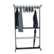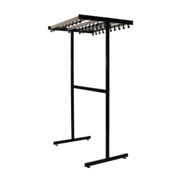 Dit stevige metalen rek beschikt over 38 metalen haken (19 per zijde), waardoor er voldoende plaats is voor jassen, tassen en andere persoonlijke spullen. De combinatie van grijs met zwarte accenten geeft het geheel een moderne en professionele uitstraling.