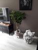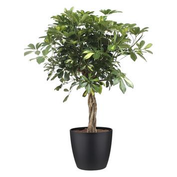 Vingerboom (Gold Capella) met ronde Elho Brussels bloempot in Zwart. De Vingerboom komt uit Taiwan. Door de vorm van de bladeren en hoogte, wordt de plant daar ook wel de ‘dwergparapluboom’ genoemd. Deze Gold Capella variant heeft een stoere gevlochten stam en sierlijke groene blaadjes. De plant heeft een hoogte van 100 centimeter met een pot van 27 centimeter in diameter. De Schefflera is een makkelijke huisplant. Je hoeft er geen groene vingers voor te hebben.