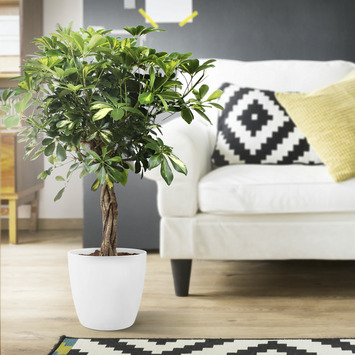 De Vingerboom komt uit Taiwan. Door de vorm van de bladeren en hoogte, wordt de plant daar ook wel de ‘dwergparapluboom’ genoemd. Deze Gold Capella variant heeft een stoere gevlochten stam en sierlijke groene blaadjes. De plant heeft een hoogte van 100 centimeter met een pot van 27 centimeter in diameter. De Schefflera is een makkelijke huisplant. Je hoeft er geen groene vingers voor te hebben.