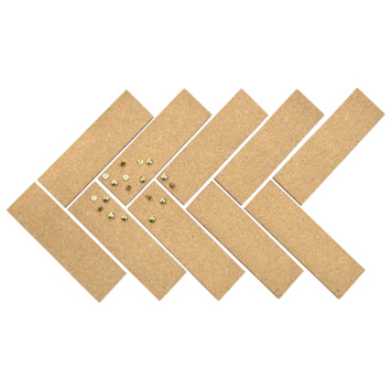 Deze visgraat muurdecoratie bestaat uit een set van 10 kurk panelen die je als prikbord aan de wand kunt bevestigen. Doormiddel van de bijgeleverde pinnetjes kun je allerlei persoonlijke notes aan de panelen hangen. De panelen hebben een zelfklevende achterzijde en zijn 23x7 centimeter.
