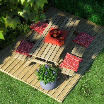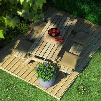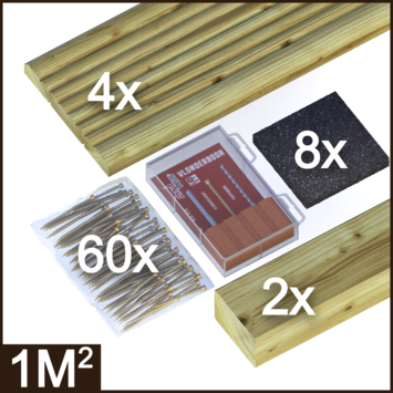 Het pakket bevat per 1 m²: 4x grenen vlonderplanken (1,9 x 14 x 240 cm), 2x grenen onderregels (4,4 x 6,8 x 240 cm), 10x rubber regeldragers, en 60x vlonderschroeven. Het anti-worteldoek moet apart worden gekocht. De geimpregneerde planken en onderregels garanderen een lange levensduur en bescherming tegen schimmels.
